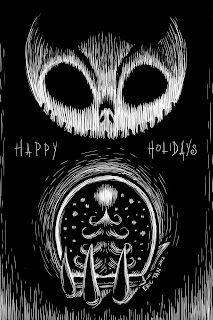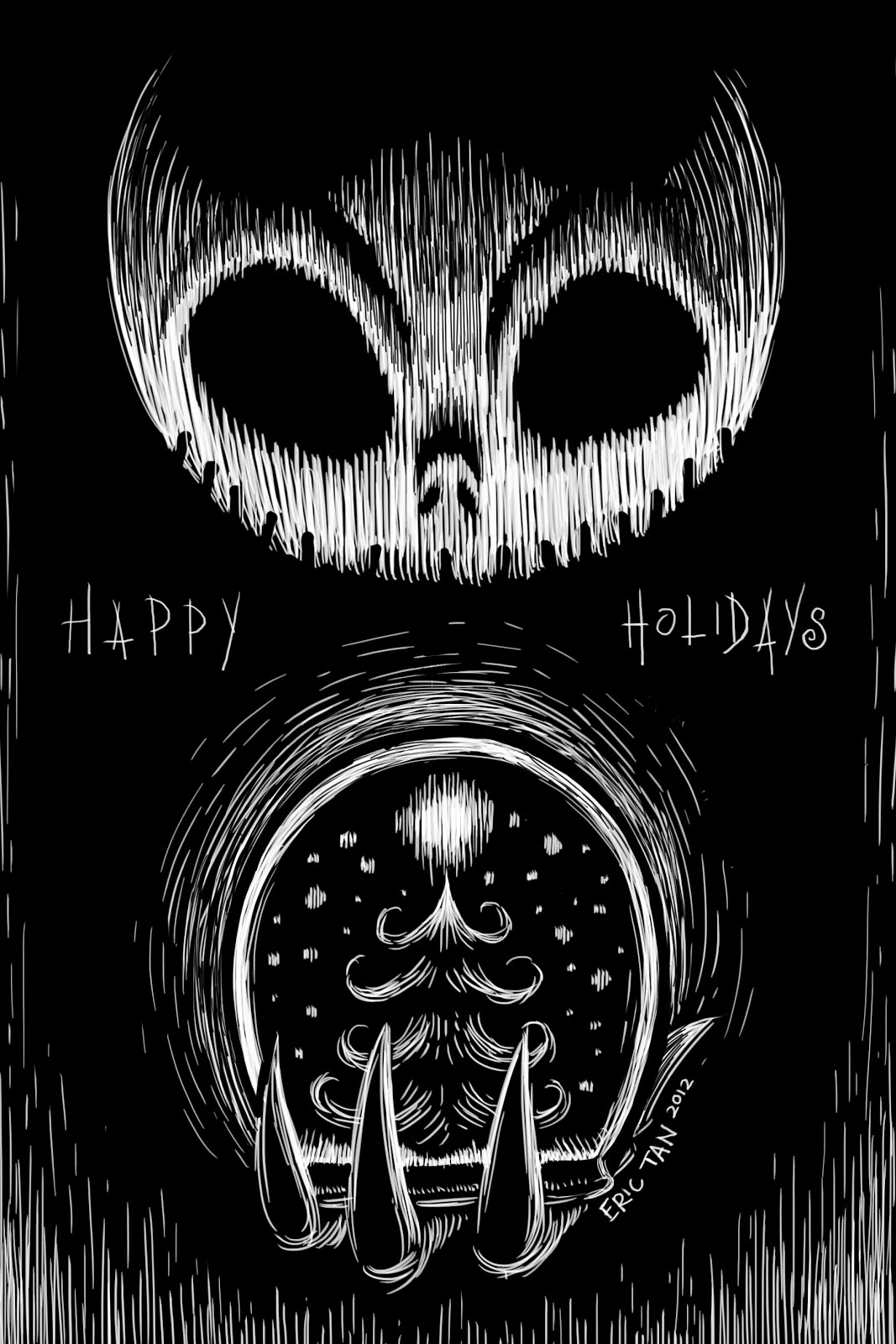 I find creating the cards to be my favorite project all year. I enjoy the challenge of squeezing even more sickness outta this brain and it's one of the only things I get to do that doesn't involve clients, art directors, buyers, and movie studios...wait, I enjoy those challenges too. Okay, I'll admit, I think I love working on these things so much because of that precious moment when I show my grandma the card, she takes a look and realizes that her grandson is an idiot, then she smiles uncomfortably and hands it back to me. I'll say "But grandma, I made it for you!", then she'll just pat me on the head and roll away. I live for those moments!