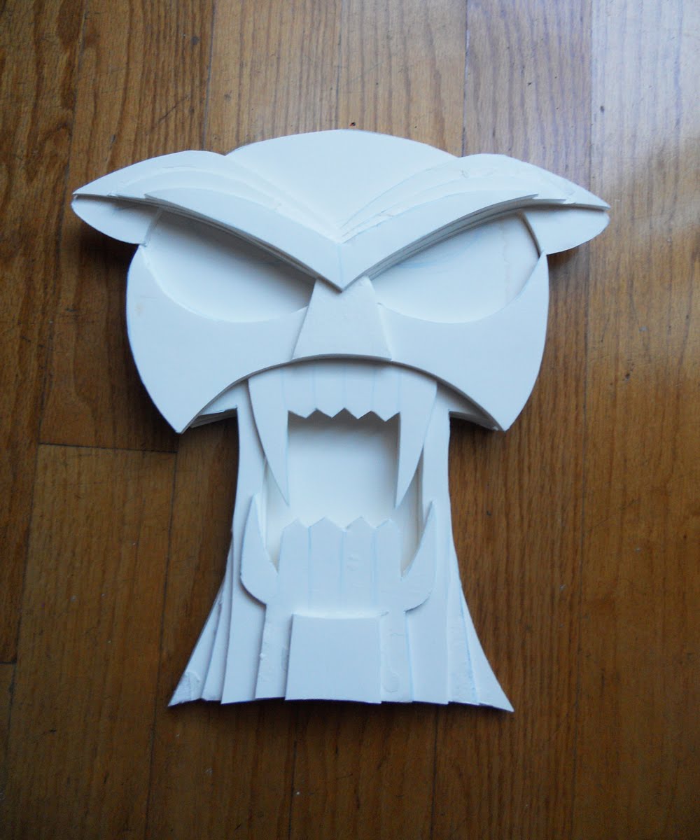 The resin is then mixed and sculpted directly onto the foam. I'll work on one section at a time such as the forehead, brows, and eyes and let it harden before i go onto other parts. Believe me, I'd rather carve a tiki mask out of actually wood, but I suck with saws and would probably cut a finger or two off, so resin is the safer option for me. After the sculpt is complete, I'll airbrush the base coat of paint then add in the detail touches with a brush. Those are bamboo shoots that make up his headdress.